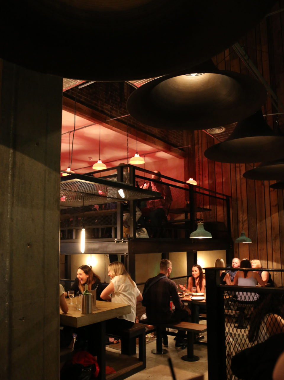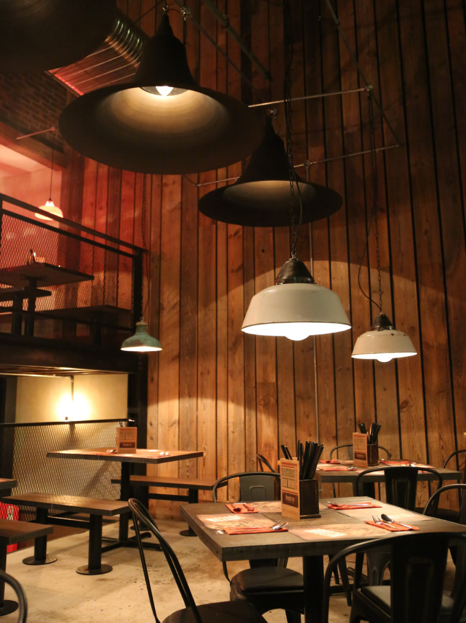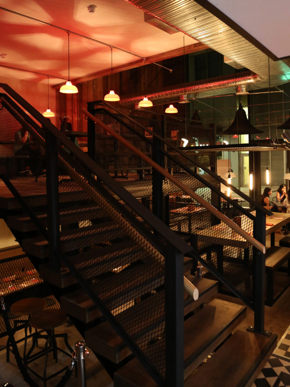 The Banana Tree restaurant in Milton Keynes is a fitout of space in the contemporary Brooklyn House. Serving Malaysian fusion cuisine, the Banana Tree brief was to create a variety of spaces, sometimes comforting and snug and in other parts of the restaurant, open and inviting. The material palette uses massive wood beams, exposed concrete and blackened steel to create galleries, sunken seating, hanging chairs and bespoke mood lighting fixtures.
