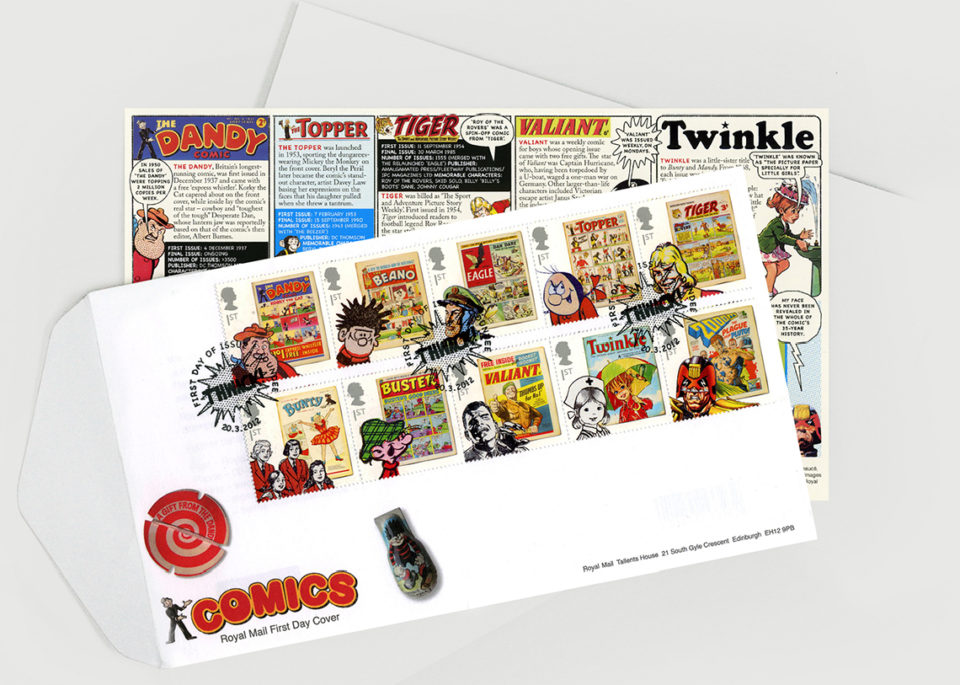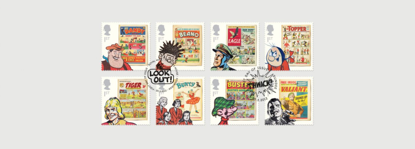 Gosh!, Golly!, Gasp! And that was just us when we were asked by the Royal Mail to design a set of stamps celebrating 75yrs of classic British comics. Eventually a fairly classic route was agreed upon featuring a typical cover along with a portrait of a favourite character. Dennis the Menace seems to feature in most people’s favourites!