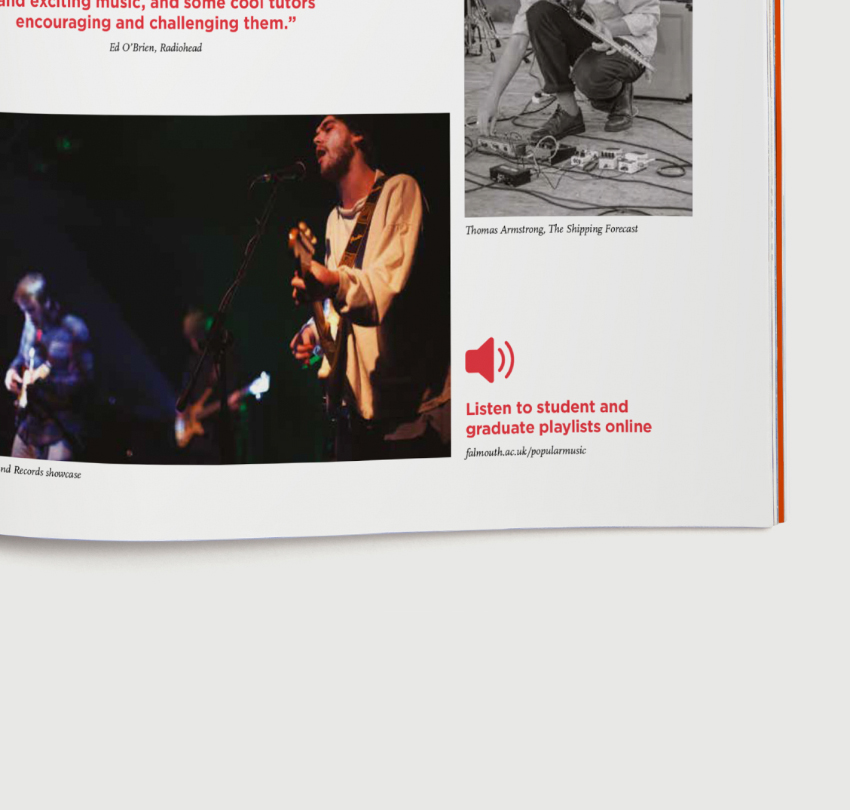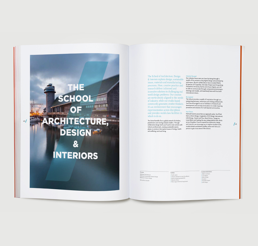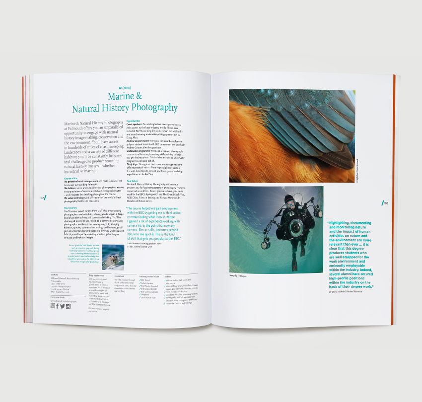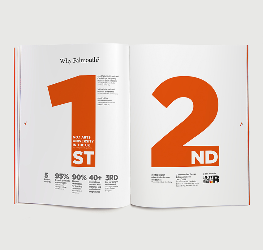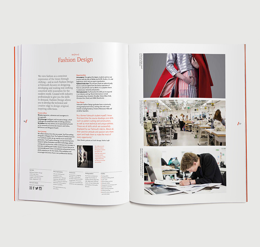 Of course it’s lovely to study at a university that’s settled on the beautiful Cornish coastline. But let’s not forget the absolute reason you’re there is to study. So this prospectus for Falmouth University became a gallery of the work students are producing, illustrating what its alumni have gone on to achieve.