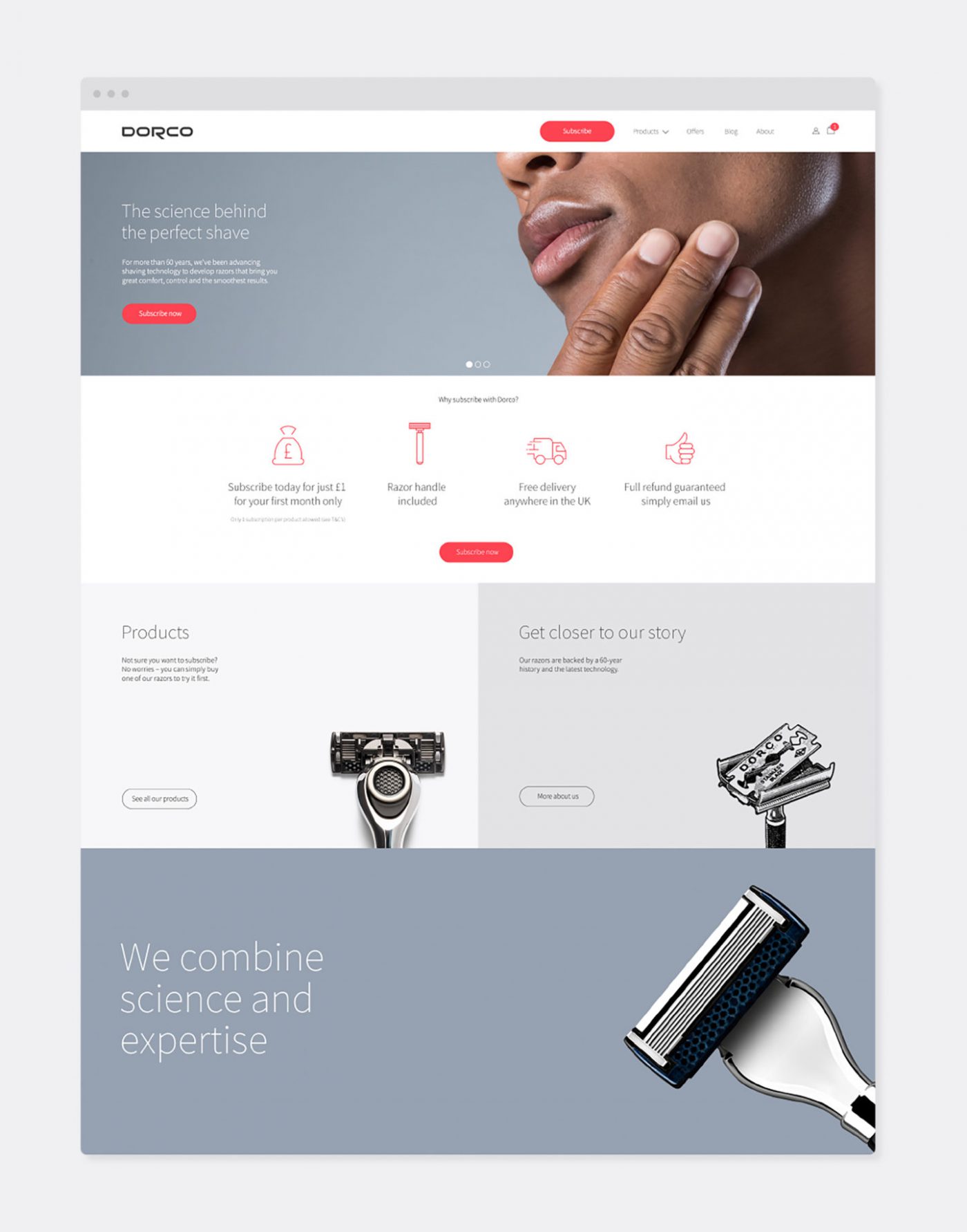 To support this in the website design, we contrasted soft-focus model photography with close-up shots of the razors in very sharp focus, showing their scientific detail. This juxtaposition of the soft curves of the models with the hard angles of the products illustrates very clearly the intimate relationship between Dorco’s razors and the people who use them.