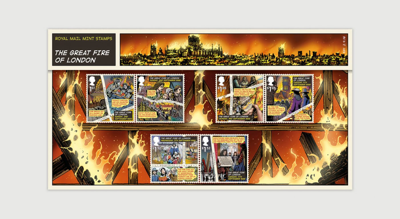 Designed to appeal to a younger audience, London’s streets and the River Thames divide our Great Fire of London stamps into graphic novel style panels adding a sense of place as the drama and panic of the story unfolds.