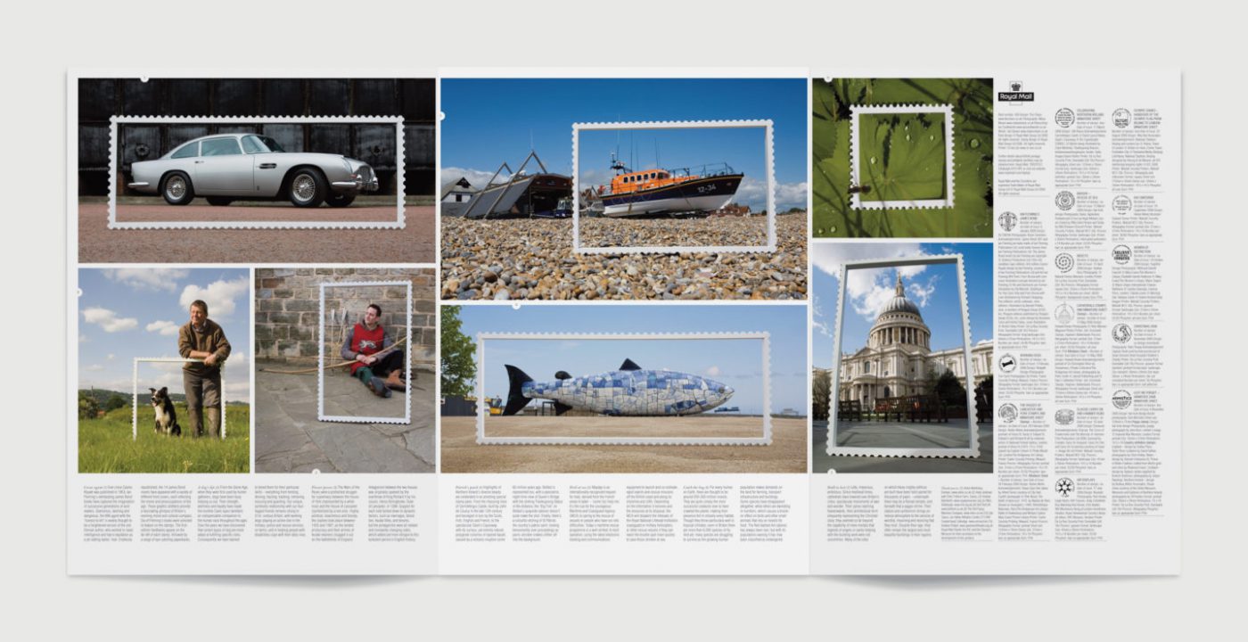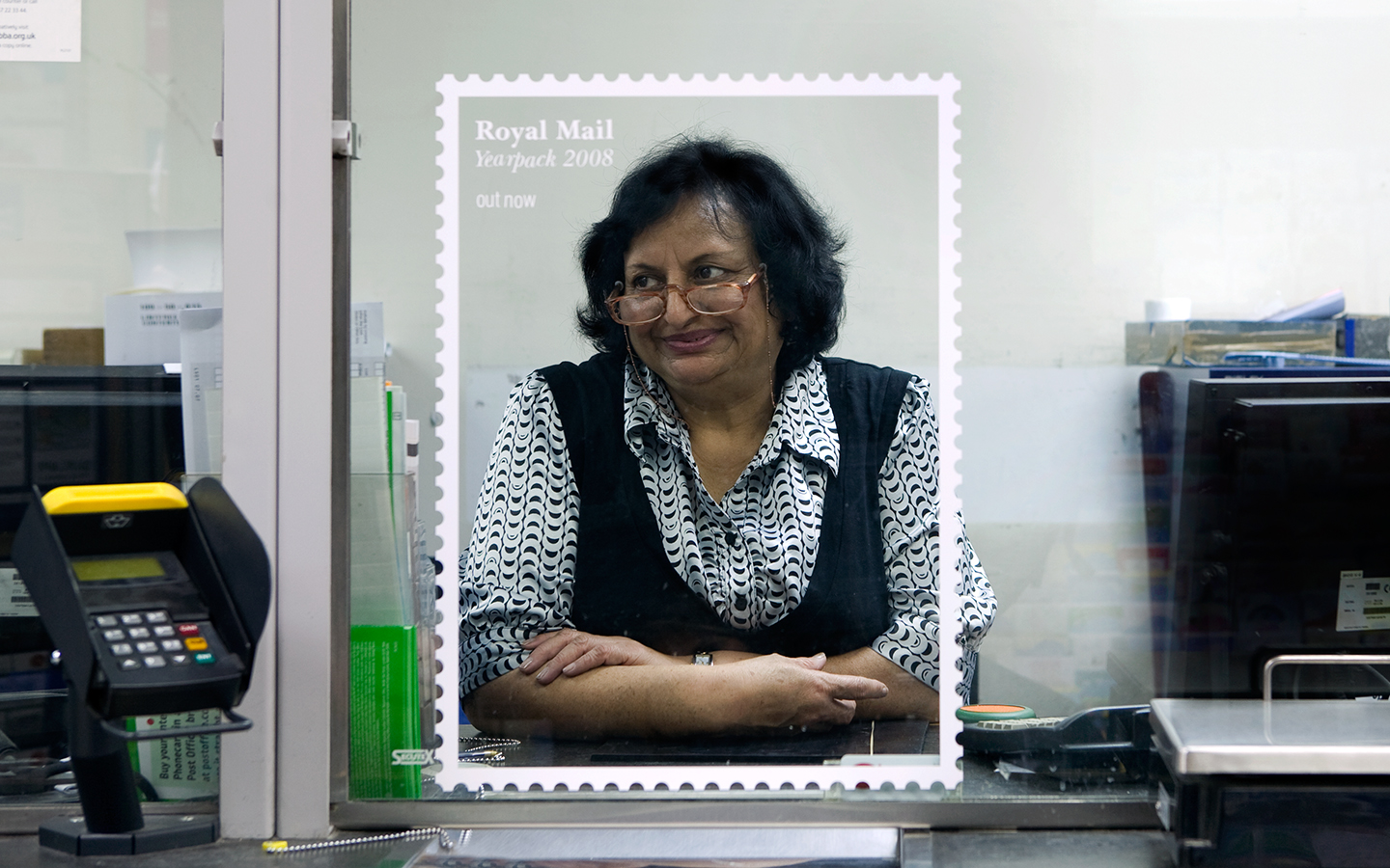 Larger than life 3D frames were built and photographed in locations echoing the subject matter of the stamp issue. Each subject is also supported by brief copy explaining why and how each stamp was conceived and produced. The concept was then taken through to ambient vinyl pieces. Comically framing the smiling assistant into a living stamp.