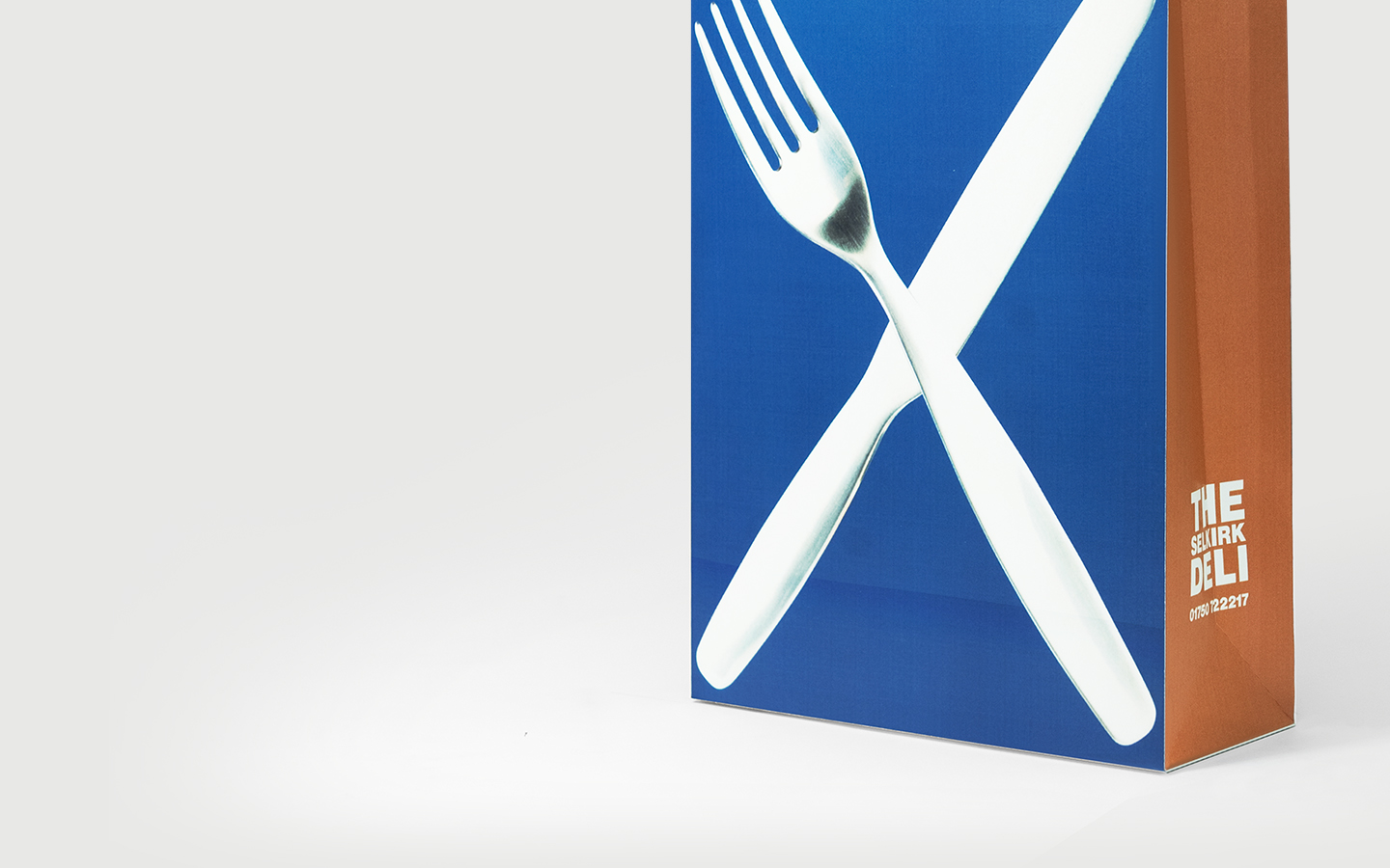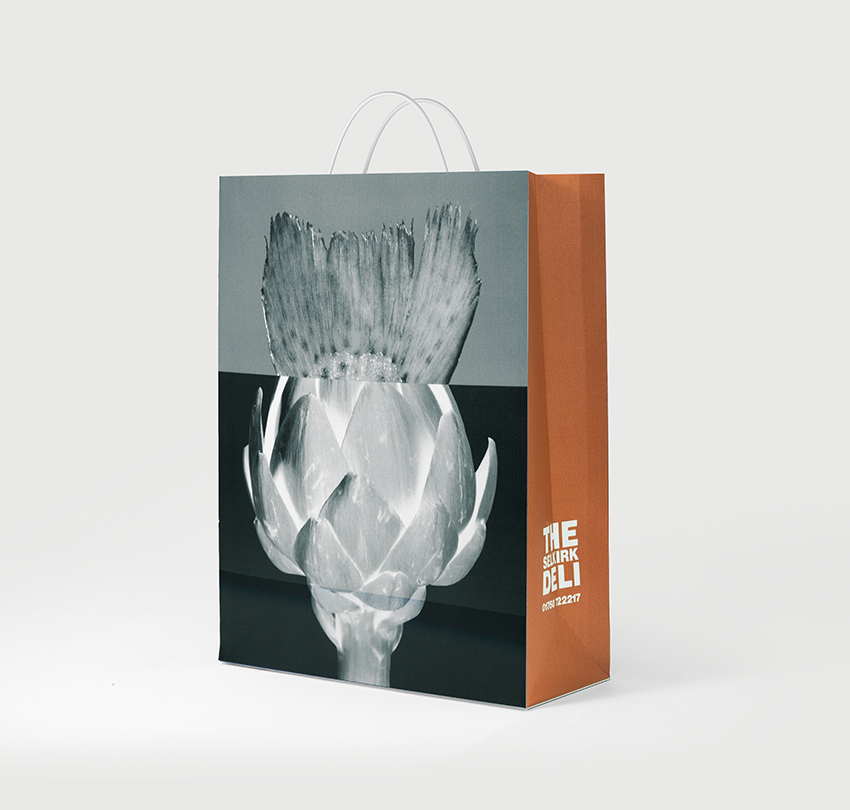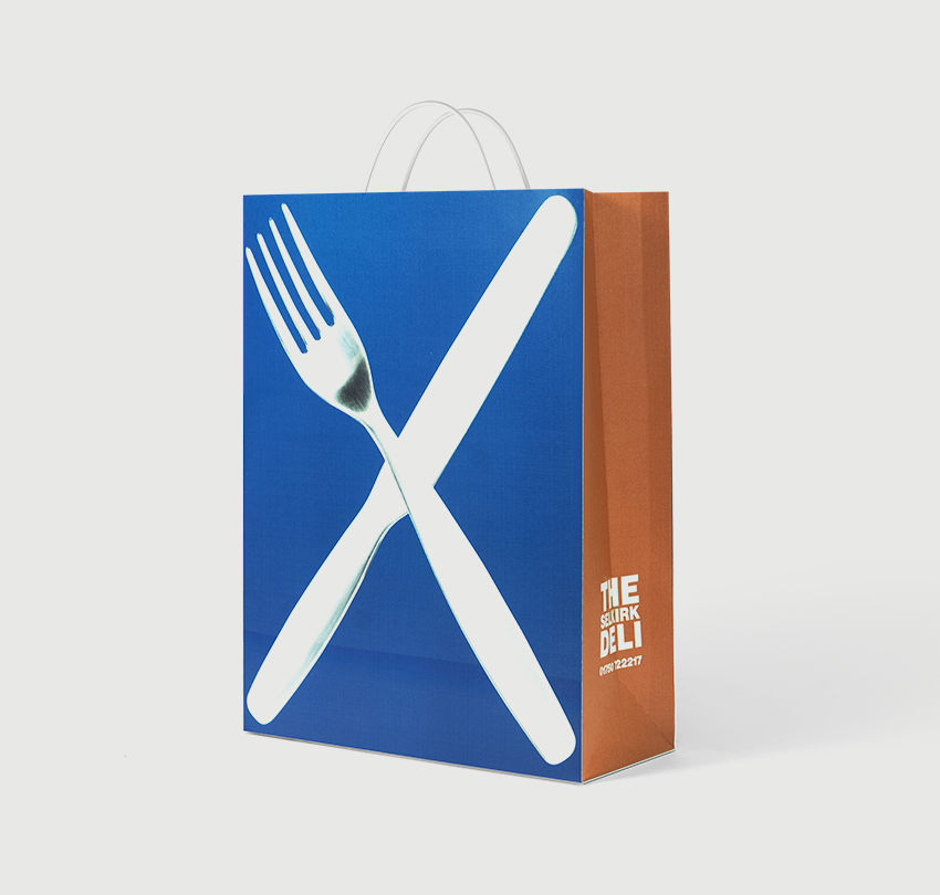 A carrier bag for a deli in Scotland. The design takes its inspiration from the Saltire (Scottish Flag) and its National symbol, the thistle.