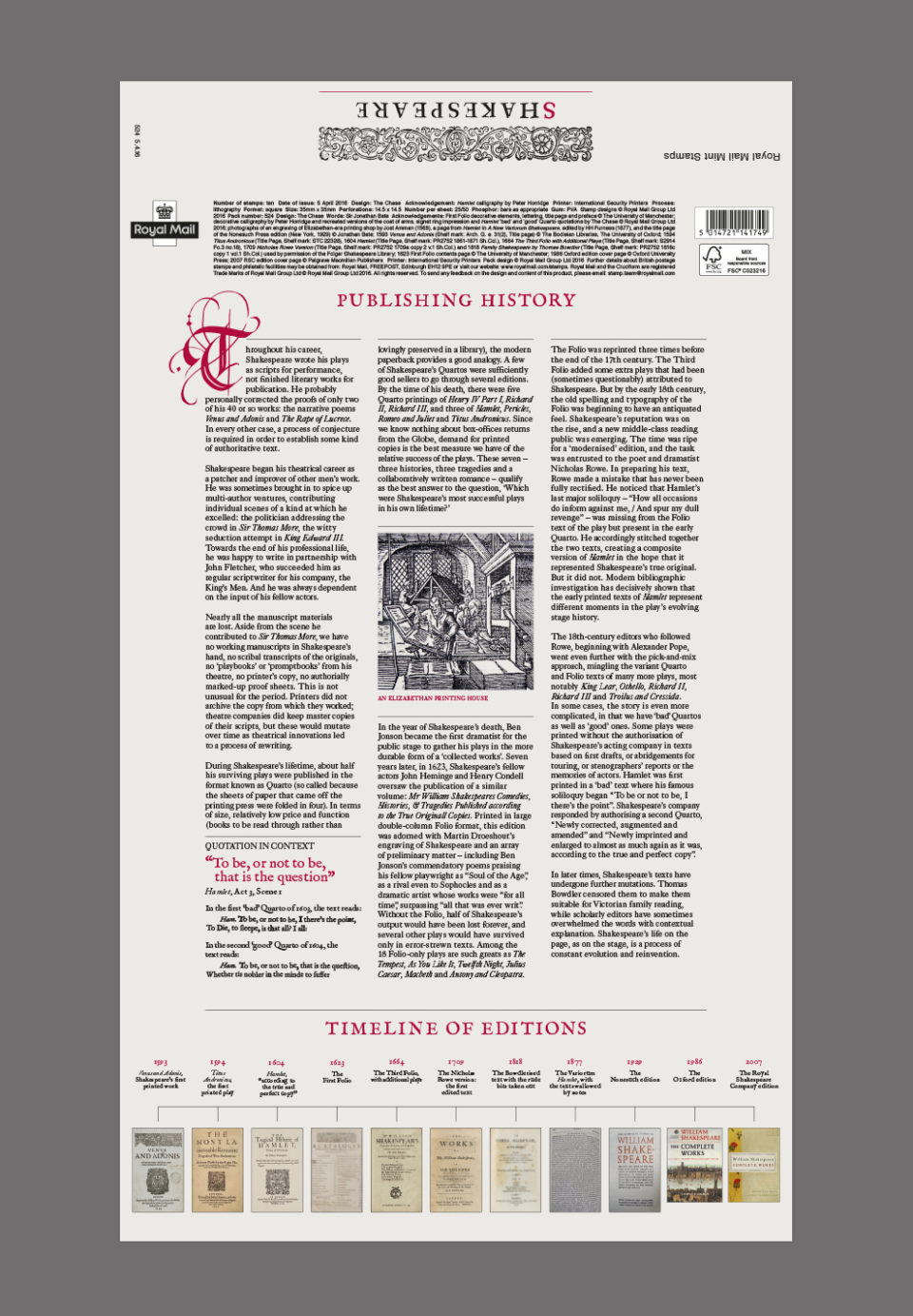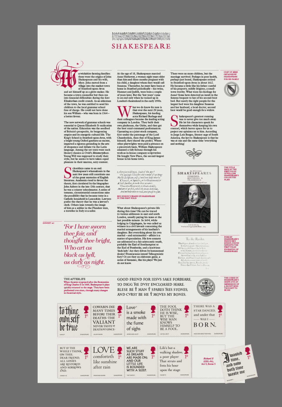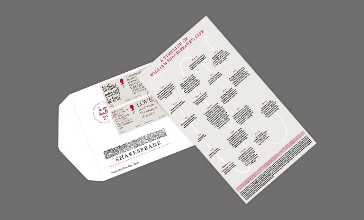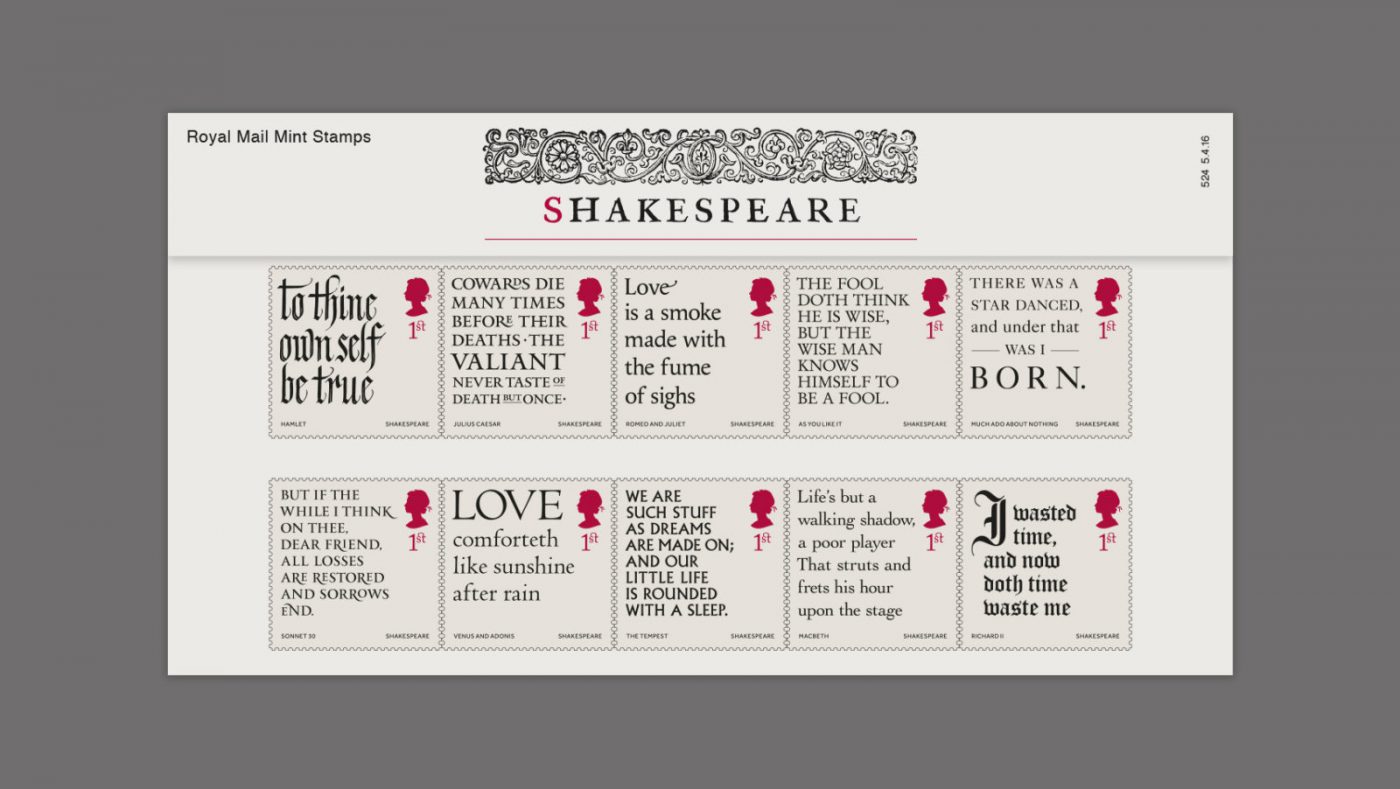 William Shakespeare is considered the greatest writer in the history of the English language. With 2016 marking the 400th anniversary of his death the Royal Mail invited us to design a set of stamps and accompanying presentation pack to commemorate his lasting legacy.